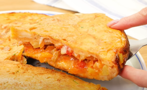 Iseckajte luk na manje komade i propržite na suncokretovom ulju, dodajte izgnječen beli luk, promešajte i pržite 5-7 minuta. Izrendanu šargarepu pomešajte sa lukom, a onda i sitno iseckane paprike. Poklopite tiganj i dinstati na srednjoj temperaturi 10 minuta. Dodajte i sitno isckan paradajz, posolite, pobiberite i sve dobro promešajte. Dinstajte još 10 minuta i sklonite sa šporeta. U činiju dobro umutite jaja, pa dodajte mleko, papriku, so, biber, sitno iseckanu mirođiju i hleb iskidan na parčiće, sve dobro promešati, tako da izgleda kao testo. Podelite ga na dva dela, a zatim prvi deo stavite u tiganj i rasporedite ga celom dužinom, kao palačinku, zatim preko pravilno rasporedite smesu dobijenu od šaragrepe i paprike. Narendajte sir, a onda rasporedite i drugi deo smese. Sve poklopite i pržite na srednjoj temperaturi 7 minuta. Koristeći tanjir okrenite jelo na drugu stranu kako bi ste ga dobro zapekli i zapecite još 5 minuta.