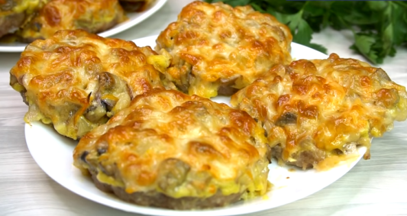 Hleb iseckajte na kockice i prelijte vodom. Ocedite, pa stavite u blender i dodajte crni i beli luk. Dobijenu kašu sipajte u mleveno meso. Posolite i pobiberite po ukusu, pa sjedinite. Napravite veće ćufte, pa iz pomoć okruglog kalupa napravite pljeskavice. Poređajte na pleh obložen pek papirom. Pečurke i luk iseckajte, a šargarepu izrendajte. Propržite luk i pečurke, pa sipajte u posudu. Dodajte šargarepu i jaje, posolite i pobiberita, pa dodajte i majonez/pavlaku. Sve dobro promešajte. Sipajte fil preko pljeskavica, pa pospite svaku izrendanim sirom. Pecite na 200°C nekih 20 minuta.