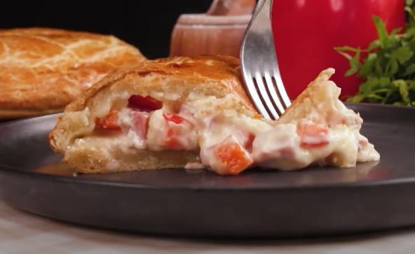 Lisnato testo izbockajte viljuškom. Najbolje bi bilo da bude okruglo, ali može i četvrtasto. Jednu koru stavite u tepsiju koja je obložena papirom za pečenje. Papriku i šunku iseckajte na sitne kockice, a sir izrendajte. Sve pomešajte u jednoj činiji sa krem sirom. Zatim tu smesu stavite preko lisnate kore, utapkajte da bude ravnomerno. Prekrijte drugim delom testa, premažite ga jajetom i pecite na 180 stepeni 40 minuta.