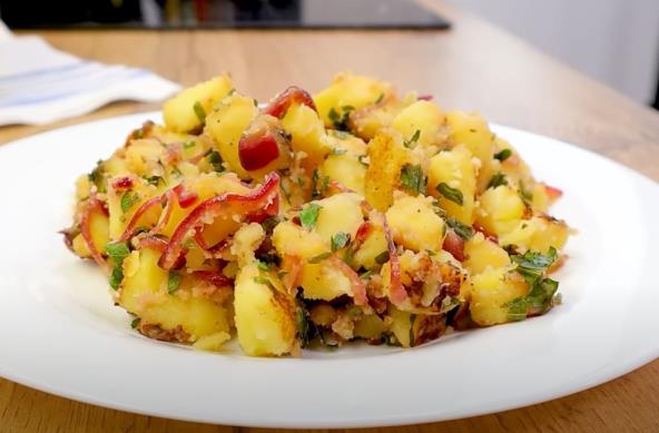 Krompir isecite što sitnije, posolite i kuvajte dok ne omekša. U tiganj sa maslinovim uljem stavite iseckan crveni i beli luk, pa dodajte jabukovo sirće, vodu, šećer, malo soli i bibera, sve izmešajte i dodajte skuvani krompir, a onda i sitno iseckan peršun. Mešajte još malo, a onda ga servirajte uz piletinu ili neku ribu po izboru.