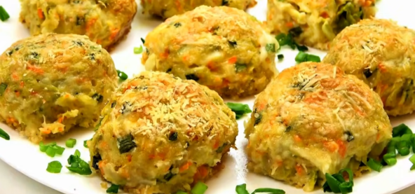 Kupus isecite na trake, a šargarepu izrendajte. Prelijte vodom i kuvajte nekih 10 minuta. Procedite i pomešajte sa rendanim sirom. Dodajte jaja, prezle, iseckani mladi luk i sve dobro sjedinite. Kašikom vadite smesu i dodajte parčence mocarele, oblikujte loptu i uvaljajte u parmezan. Tepsiju nauljite i pospite prezlama, pa poređajte ćufte. Pecite na 180°C nekih 30 minuta.
