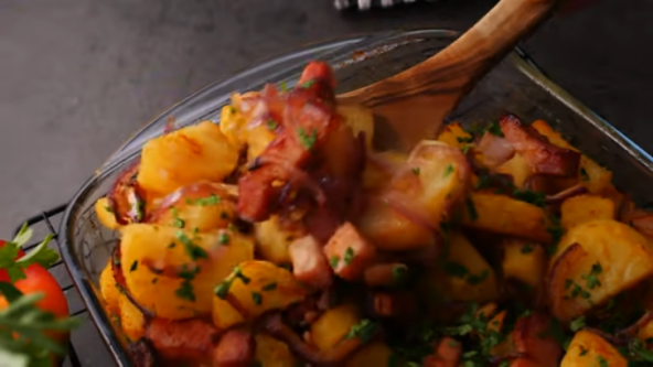Pečeni krompir je odličan prilog bilo kojem mesu. Ovako pripremljen možete da jedete sam, zato što se peče sa slaninom i lukom, pa ćete biti siti. Takođe, možete da ga polužite sa belim domaćim sirom kao večeru. Ukus je neverovan, a prirpema jednostavna. Uživajte!