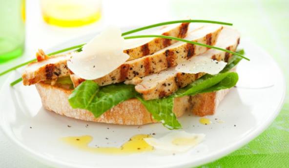 4. Stavite na hleb zelenu salatu, pa preko isečenu piletinu i prelijte sosom. Ukrasite listovima parmezana.