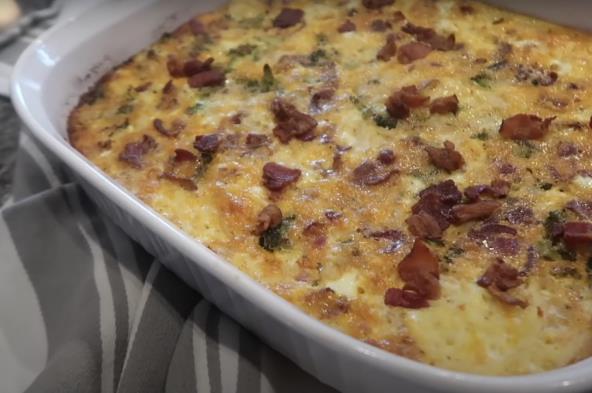 Umutite jaja s mlekom i pola količine sira, pa umešajte povrće i otprilike tri četvrtine slanine. Začinite solju i biberom. Sipajte mešavinu u pleh, na vrh stavite ostatak sira. Zapecite oko 20 minuta, pa pospite ostatkom slanine i pecite još dvadesetak. Važno je da ostavite da odstoji deset minuta kada izvadite iz rerne da biste mogli lakše da sečete.