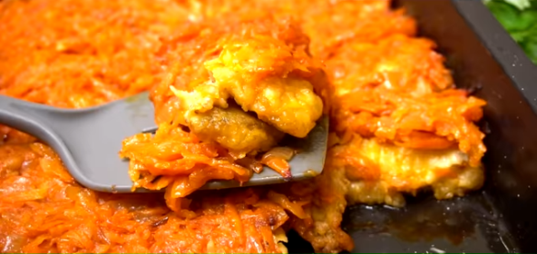 File posolite i pobiberite, pa uvaljajte u brašno. Ispržite na ulju. Crni luk i šargarepu narednajte i propržite. Dodajte i kečap, lepo promešajte. Sklonite sa vatre. U tepsiju koju ste premazali ulje poređajte ribu, preko rasporedite povrće. Stavite lovorov list i biber i pokrijte folijom. Pecite na 180°C oko 30 minuta.