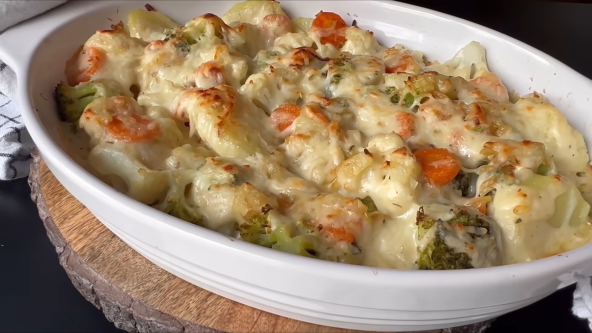 Brokoli i karfiol isecite, kao i krompir, ali njega na kolutove. Kuvajte povrće na pari. Šargarepu i luk sitno iseckajte i propržite na malo ulja i putera. U nauljenu tepsiju stavite kuvano povrće i dodajte proprženo povrće. Istopite puter, pa dodajte brašno. Mešajte dok ne dobije zlatnu boju, uz neprestano mešanje, pa sipajte bujon. Kad proključa dodajte pavlaku za kuvanje i dobro promešajte. Začinite po želji i dodajte parmezan i beli luk u prahu. Kuvajte još kratko i sve vreme dok se kuva sos ne prestajete da ga mešate. Prelijte preko povrća. Pospite rendanim sirom i pecite u rerni na 200°C oko 20 minuta.