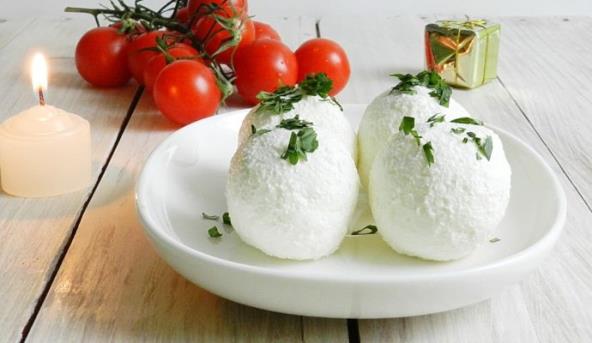 Viljuškom izgnječite sir (ovde se zapravo radi o kravljem siru spremljenom na grčki način koji je prilično kremast; ukoliko koristite pravu grčku fetu, pomešajte je sa malo krem sira). Na dlan stavite kašičicu sira i pritisnite, preko stavite 1 čeri paradajz i još jednu kašičicu sira, pa dlanovima oblikujte kuglice. Ponovite postupak sa ostatkom sira i paradajza. Ređajte kuglice na tanjir za serviranje i pospite peršunom (peršun možete zameniti sušenim origanom).