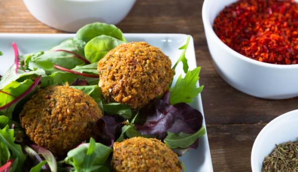 3. Očistite mladi luk, operite ga i isecite na kolutove. Pomešajte mladi luk, prašak za pecivo, kim, korijander, 1 ½ kašicicu soli, harisu i limunov sok sa masom od leblebija. Od mase vlažnim rukama pravite loptice (oko 20 komada) i uvaljajte ih u susam. Ulje zagrejte na 160 stepeni, pa pržite falafel oko 4 minuta. Slažite loptice na kuhinjski papir da se ocede.