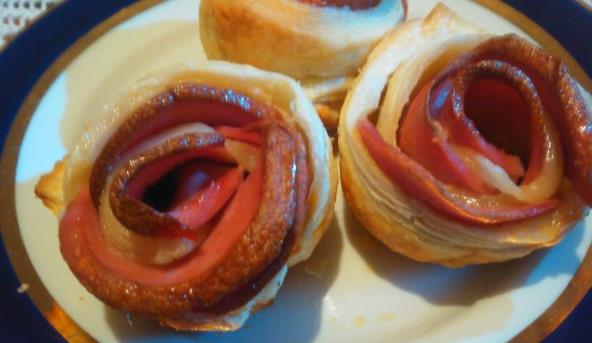 2. Salamu iseći na pola i ređati na trake od lisnatog testa. Deo trake mora ostati prazan. Zatim uviti traku da se dobije ruža. ružice stavite u podmazan kalup za mafine.