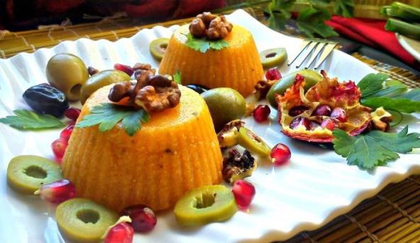 1. Vodu staviti da provri, pa skuvati palentu po uputstvu sa kesice. Začiniti po ukusu i dodati mlevene orahe. Palentu sipati u modlice (po želji).