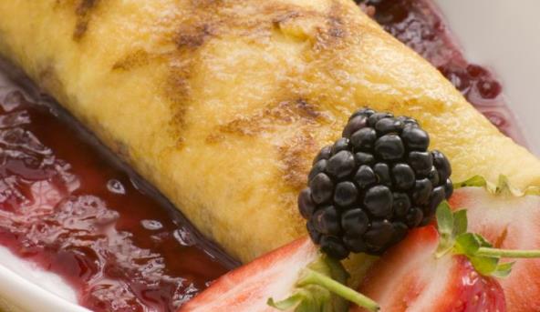 3. Stavite ispečen omlet na tanjir, preko dodajte sir i bobičasto voće, urolajte omlet i poslužite. Po ukusu možete dodati i malo meda ukoliko volite slađi doručak.
