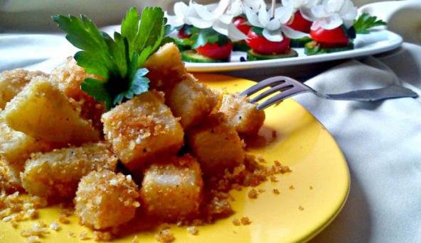Na ulju propržiti prezle i susam na nižoj temperaturi uz povremeno mešanje - dok prezle blago ne porumene. Ocediti višak tečnosti iz celera (ukoliko je ima) sipati ga u "odelo" (u mešavinu prezli i susama), izmešati i posuti morskom solju i biberom.