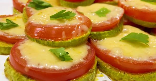 Tikvice isecite na kolutove, pa ih posolite i ostavite da puste vodu. Zatim ih dobro osušite. Poređajte na pleh obložen pek papirom, pa ih zasecite na 2 mesta po sredini. U maslinovo ulje dodajte so, biber, beli luk u prahu, mlevenu papriku i suvu mirđiju, promešajte i prelijte tikvice. Pecite na 200°C oko 10 minuta. Preko tikvica stavite paradajz isečen na kolutove, pa pospite rendanim sirom. Pecite na 200°C oko 10 minuta. Ukrasite peršunom.