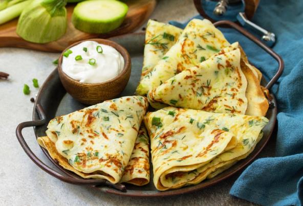 Izrendajte tikvice, posolite ih i ostavite desetak minuta, da puste višak tečnosti. Nakon tog vremena ih malo rukama stisnite da se u potpunosti ocede. Jaja umutite, pa dodajte brašno, izrendani sir, iseckanu mirođiju, so, biber, mleko i dodajte tikvice koje ste prethodno iscedili. Dodajte kiselu vodu tako da dobijete smesu koja je gušća nego za palačinke. Smesu dobro izmešajte, pa ispržite palačinke u nauljenom tiganju, po nekoliko minuta sa obe strane, dok ne dobiju zlatastu koricu. Mažite ih nadevom po želji, kao što je krem sir, pavlaka, a možete da dodate i nekoliko lista šunke.