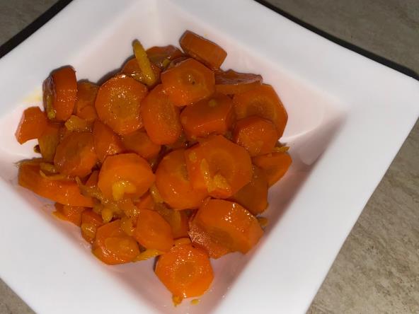 Isecite šargarepu na kolutove, pa istopite puter u šerpi. Zatim dodajte šargarepu, a posle 2-3 minuta dodajte koru od pomorandže i sok. Dobro promešajte i kuvajte poklopljeno nekih 10-ak minuta. Zatim dodajte med i lepo promešajte da se sve sjedini.