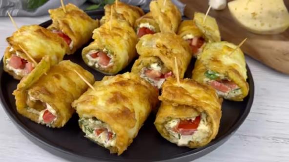 Tikvice isecite na kriške po dužini. Posolite i ostavite da puste vodu. Sir izrendajte i pomešajte sa mlevenim belim lukom, seckanim peršunom i majonezom. Tikvice dobro osušite i onda uvaljajte u brašno, pa u umućena jaja. Ispržite i vadite na ubrus da se ocede. Premažite ih smesom sa sirom, pa stavite preko iseckani paradajz i urolajte. Zatvorite čačkalicom.