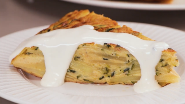 Krompir i tikvicu isecite na kolutove. Propržite na malo ulja, pa posolite i pobiberite. Zatim sipajte povrće u posudu, a u drugoj umutite jaja sa pavlakom. Dodajte griz i promešajte. Sipajte preko povrća, promešajte i vratite u tiganj koji ste ponovo malo nauljili. Poklopite i pecite 10 minuta, a zatim okrenite na drugu stranu, ponovo poklopite i pecite još 5 minuta.