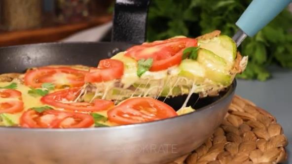 Pečurke i tikvice isecite, pa propžite na ulju. Dodajte i seckani beli luk. Jaja umutite sa začinima po želji, sipajte jaja preko i poklopite. Pecite na niskoj temepraturi 7 minuta, pa pospite rendani sir, paradajz isečen na kolutove i ponovo poklopite. Pecite još 5 minuta.