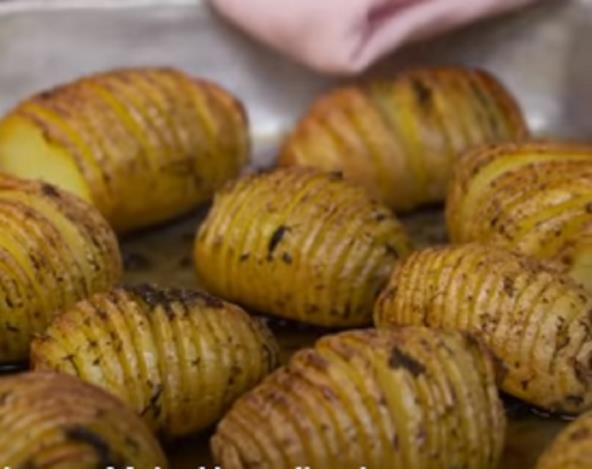 Krompir dobeo operite i stavite između 2 varjače i krenite da sečete (kao da želite kolutove da napravite). Varjače će sprečiti da isečete krompir do kraja, zato su obavezne. Ruzmarin samo sameljite u avanu, pa dodajte maslinovo ulje i dobro sjedinite. Svaki krompir dobro utrljajte ovom smesom i posolite. Pecite na 200°C dok ne bude gotov.