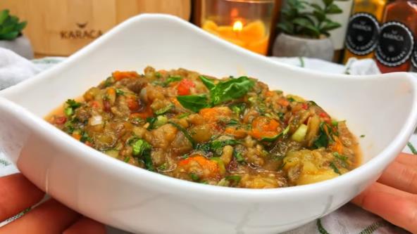 Na nekoliko mesta probodite patlidžan viljuškom, a papriku očistite iznutra i poređajte na pleh obložen pek papirom. Paradajz takođe poređajte i isto ga probodite viljuškom na par mesta i dodajte crni luk. Pecite na 190°C oko 30 minuta. Oljuštite povrće i sitno iseckajte, pa stavite u činiju. Pospite seckanom mirođijom, peršunom, bosiljkom i mladim lukom. Prelijte maslinovim uljem. Dobro promešajte i dodajte skuvan pirinač. Lepo sjedinite.