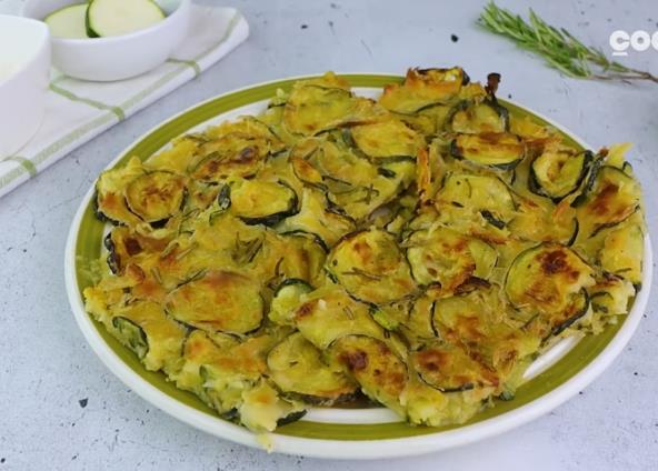 Tikvice i luk očistite, isecite na kolutove, pa prebacite u činiju. Posolite i pobiberite i ostavite oko pola sata, da povrće pusti višak vode. Nakon nekog vremena tikvice i luk ocedite i izvadite iz činije, a u vodu koja je ostala dodajte kukuruzno brašno i brašno, sipajte malo maslinovog ulja, pa dobro sve izmešajte. Tikvice i luk poređajte u pleh, sipajte testo preko povrća i dobro promešajte. Pospite sa malo ruzmarina, prelijte sa još ulja, pa pecite u zagrejanoj rerni na 220 stepeni oko pola sata.