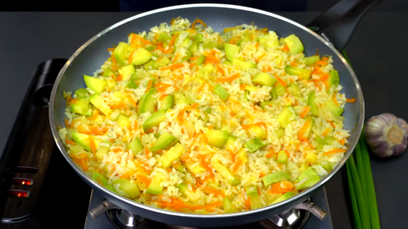Iskecajte crni luk, pa propžite na ulju. Dodajte rendanu šargarepu, a nakon nekog vremena i tikvice isečene na kockice. Poklopite i ostavite da se kuva nekih 5 minuta. Dodajte pirinač koji ste prethodno oprali i promešajte. Sipajte vodu i opet promešajte. Poklopite i kuvajte nekih 25 minuta.