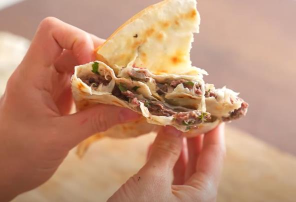 Sitno iseckajte luk i peršun. Dodati u mleveno meso. Dodajte so i crni biber po ukusu. Navlažite tortilje u vodi. Rasporedite mleveno meso preko jedne polovine tortilje. Pospite sirom. Poklopite tortilju i pržite na suvom tiganju po 4 minuta sa svake strane. Kada su gotove premažite puterom uz pomoć četkice.