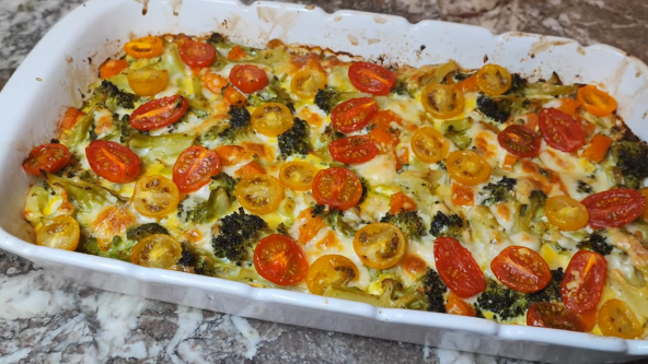 Na malo ulja propržite seckani crni luk, pa dodajte šargarepu. Zatim dodajte seckani brokoli i sipajte vodu, posolite i pobiberite, poklopite i kuvajte nekih 10 minuta. Jaja umutite sa mlekom i uljem. Posolite i pobiberite, pa dodajte parmezan. Nauljite tepsiju i pospite prezlama, pa sipajte povrće. Prelijte smesom od jaja i pospite rendanim tvrdim sirom. Poređajte paradajz isečen na polovine. Pecite na 180°C oko 20-25 minuta.