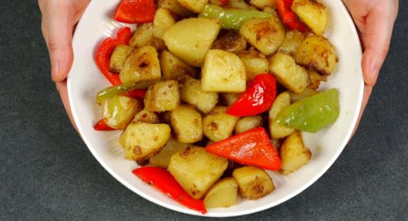 U šerpu stavite iseckan i očišćen krompir, dodajte so, ruzmarin i nalijte vodu. Kuvajte na srednjoj vatri oko 10 min. Zatim ocedite krompir, a paprike iseckajte, kao i beli luk. Zagrejte u tiganju ulje i puter. Propržite beli luk, pa ga izvadite a ubacite krompir. Posolite, pobiberite i dodajte koka kolu. Krčkajte. Poklopite i dinstajte 5 minuta ili dok ne ispari sva tečnost pa servirajte uz dodatak prženog belog luka.