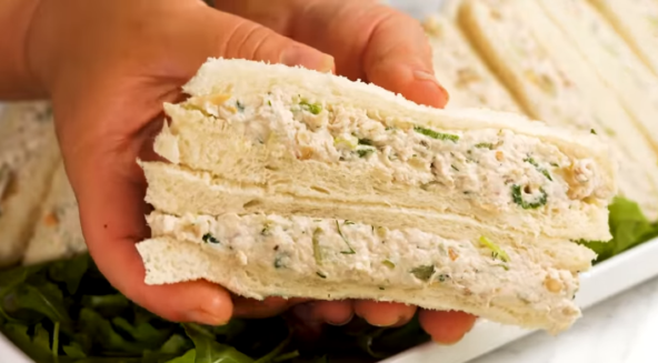 Piletinu iseckajte što sitnije možete, ili je izblendajte. Pomešajte sastojke za sos u činiji. Prelijte piletinu sosom. Dodajte celer, praziluk. orahe, kisele krastavce i mirođiju. Mešajte dok se ne sjedini. Namažite hleb puterom, pa namažite pilećom salatom. Preklopite drugom kriškom tost hleba, pa po želji odstranite kore i presecite na oblik trougla.