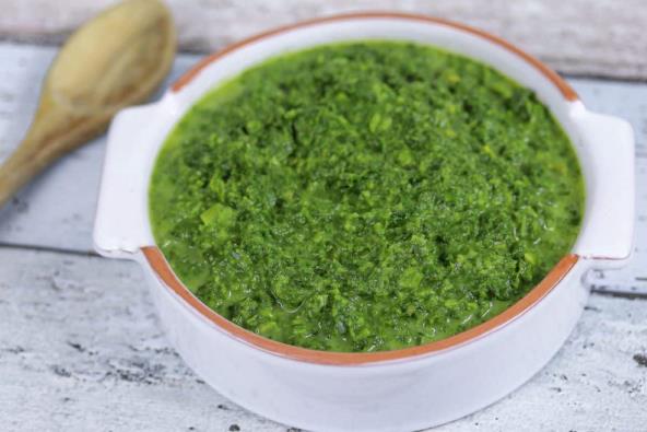 Na malo ulja propržite cele čenove belog luka i pinjole. Zatim izvadite iz šerpe. Skuvajte spanać koji ste očistili, pa beli luk, pinjole i spanać stavite u blender. Dobro izblendirajte i vratite u šerpu u kojoj ste pržili beli luk i pinjole. U pavlaku za kuvanje sipajte kukuruzno brašno i dobro promešajte, ne smeju da ostanu grudvice. Sipajte u spanać i kuvajte još 10-ak minuta, uz neprestano mešanje.