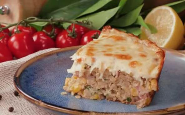 Slaninu isecite na kockice i propržite, pa dodajte proceđeni kukuruz i ostavite još 2 minuta na šporetu. Sipajte u posudu, dodajte seckani luk, paradajz, jaja, ovsene pahuljice i jogurt. Posolite i pobiberite, pa dobro promešajte. Sipajte u nauljenu tepsiju, pa pospite rendanim sirom. Pecite u rerni na 180°C oko 25 minuta.
