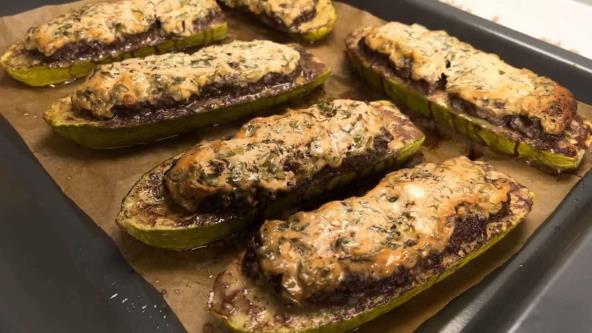 U mleveno meso dodajte sitno seckani crni luk, pa posolite i pobiberite i pospite muskatnim oraščićem, kao i začinima po želji. U posudi pomešajte ulje i italijanski začin, kao i neki po vašem ukusu. Tikvice presecite na pola po dužini, pa svaku premažite smesom od ulja. Poređajte na pleh obložen pek papirom i preko stavite deblji sloj mlevenog mesa, po celoj dužini. U jogurt dodajte mleveni beli luk, seckani mladi luk, seckani peršun, kečap kao i začine po želji, pa promešajte. Dobijenu smesu premažite preko mlevenog mesa. Pecite u zagrejanoj rerni na 180°C oko 45 minuta. Možete da služite sa pečenim krompirom.