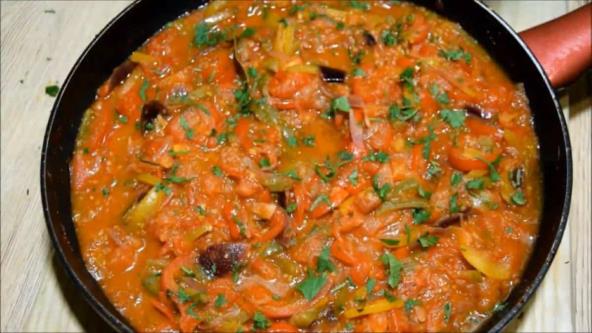 U tiganj sipajte ulje, pa dodajte crni luk isečen na rebarca. Pržite dok ne omekša, pa sipajte malo vode. Dodajte iseckane paprike, pa ako je potrebno sipajte još vode i dinstajte dok paprike ne omekšaju. Paradajz zasecite na dnu u obliku krsta i stavite u ključalu vodu 5 minuta. Zatim skinite kožicu i iscekajte ga. Dodajte u jelo i dinstajte dok većina tečnosti ne ispari. Na kraju možete da dodate isprženo jaje ili kuvani pirinač.
