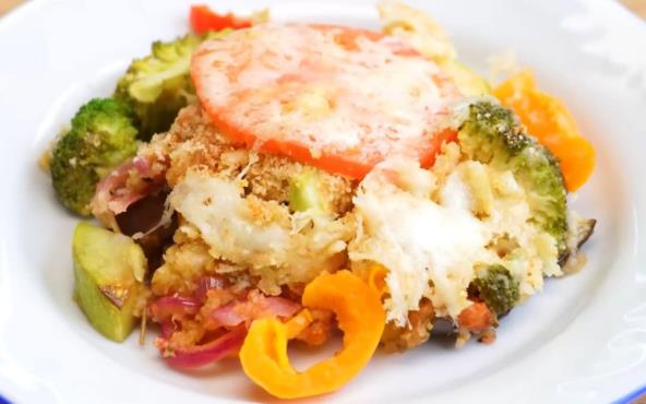 U jednu posudu stavite iseckan patlidžan i prelijte vodom, a u drugu posudu stavite iseckane tikvice i posolite. Ostavite da deluje nekih 10 minuta, pa dobro procedite. Poređajte na pleh obložen pek papirom. Posolite i prelijte maslinovim ulje, pa pecite u zagrejanoj rerni na 200°C oko 25 minuta. Isecite brokoli na cvetove, pa potopite vrelom vodom. U tiganju na malo ulja propržite na rebarca iseckan crni luk, pa dodajte papriku. Izrendajte paradajz (1 komad), posolite i pospite bosiljkom, pa promešajte. Izvadite tikvice i patlidžan iz rerne, pa poređajte proprženi luk i papriku, pa dodajte i proceđeni brokoli. Zatim sipajte paradajz sos i promešajte. Pomešajte parmezan, prezle, mleveni beli luk i ruzmarin, pa pospite preko povrća. Preko poređajte paradajz isečen na kolutove (2 komada) i pospite rendanim sirom. Prelije maslinovim uljem i vratite u rernu na još 15 minuta.