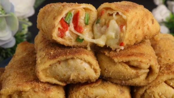 Krompir skuvajte, pa procedite i ispasirajte. Zatim u tiganju na malo ulja propržite sitno seckan crni luk, a kada malo omekša dodajte seckanu papriku. Posolite i pobiberite, pa promešajte. Poklopite i ostavite da se kuva još nekih 5-7 minuta. Dodajte u pire, kao i seckani mladi luk i rendani sir. Sve dobro sjedinite. Umutite jaja sa prstohvatom soli, šećerom, pa sipajte mleko. Sjedinite i dodajte brašno, pa opet umutite. Na kraju sipajte ulje i sjedinite. Ispržite palačinke. Stavite nadev na palačinku i urolajte, pa tako radite dok sve ne utrošite. Umutite jaja i dodajte brašno, pa sjedinite. U drugu posudu stavite prezle. Uvaljajte palačinke u jaja sa brašnom, pa u prezle. Pržite na istopljenom puteru.