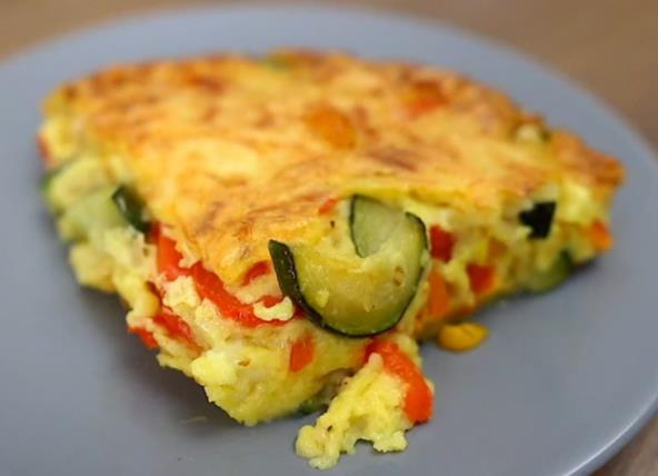 U tiganju na malo ulja propržite sitno seckani crni luk, pa kada omekša dodajte šargarepu i još kratko pržite. Zatim dodajte papriku isečenu na trake, a posle 5 minuta i seckanu tikvicu. Promešajte, pa posolite i pobiberite i opet promešajte. Gotovo povrće sipajte u vatrostalnu posudu. Umutite jaja sa mlekom i uljem, pa posolite i pobiberite, a onda dodajte brašno i prašak za pecivo. Lepo sjedinite, pa prelijte preko povrća, a onda pospite i rendanim sirom. Pecite u zagrejanoj rerni na 190°C oko 35 minuta.