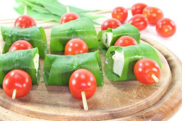 attachment-raznjici_od_sremusa_cerija_i_sira-jpg Foto: Profimedia/Shutterstock 1. Oprati čeri paradajz i sremuš i ostaviti da se osuše. Fetu iseckati na kockice. 2. Fetu umotati u listove sremuša, pa naizmenično sa paradajzom ređati na štapiće. Sastojci:24 komada čeri (koktel) paradajza250 g feta sira16 krupnijih listova sremuša8 štapića za ražnjiće