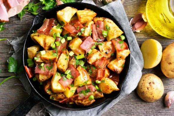 Krompir skuvajte sa sve korom, pa procedite i kada se ohladi, oljuštite. U tiganju propržite seckanu slaninu, pa kada postane hrskava izvadite. U istom tiganju propržite i sitno seckani crni luk, a kada on omekša dodajte krompir koji ste prethodno skuvali i isekli. Zatim dodajte skuvane i proceđene makarone i promešajte. Na kraju dodajte slaninu, posolite i pobiberite, pa promešajte. Gotovo jelo od krompira na kraju pospite seckanim peršunom.