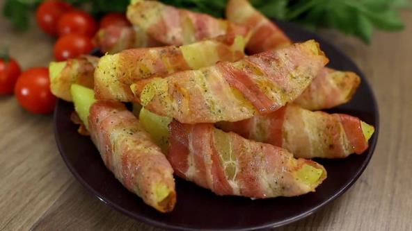 Zatim krompir posolite, pobiberite, pospite belim lukom u prahu, suvim peršunom i sve lepo promešajte. Nakon toga svako parče krompira urolajte u slaninu.