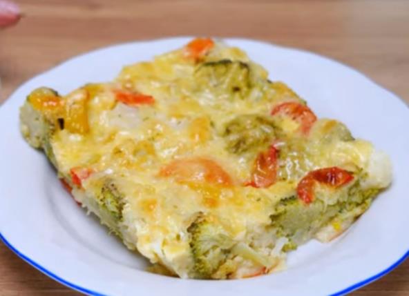 Nauljite pleh, pa poređajte prvo papriku, luk i šargarepu, pa dodajte karfiol i brokoli. Umutite jaja sa mlekom i uljem, pa dodajte mleveni beli luk. Na kraju dodajte prosejano brašno i prašak za pecivo i sve dobro sjedinite. Dodajte seckanu mirođiju i promešajte, pa prelijte preko povrća.