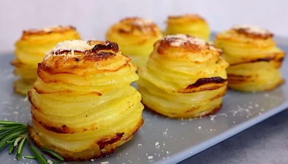 Kalup za mafine premažite puterom, pa poređajte nekoliko krugova krompira. Slažite jedan na drugi i tako dok ne dođete do vrha. Pecite u zagrejanoj rerni na 190°C oko 50 minuta.