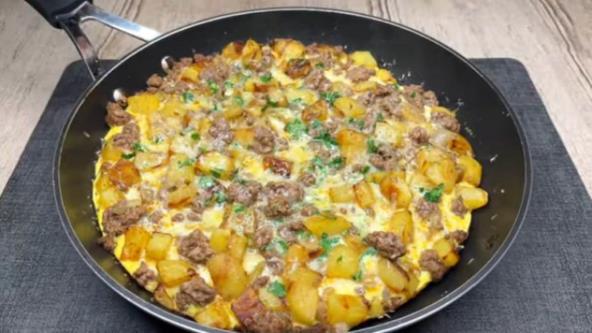 U tiganj sa mlevenim mesom dodajte krompir i promešajte. Prelijte umućenim jajaima u koja ste dodali seckani peršun i pospite sirom. Pržite još nekih 10 minuta.