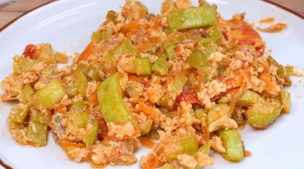 Tikvice isecite na kockice, pa posolite i promešajte. Ostavite da odstoje 10 minuta, pa procedite višak vode. U tiganju zagrejte malo maslinovog ulja, pa propržite ljubičasti luk isečen na rebarca, kao i mleveni beli luk. Kada omekša dodajte paprike isečene na trake, kao i rendanu šargarepu. Posolite, promešajte i poklopite. Dinstajte 5 minuta, pa dodajte proceđene tikvice. Poklopite i kuvajte dok povrće ne omekša. Zatim dodajte iseckan paradajz i paradajz sos. Promešajte, pa dodajte umućena jaja koja ste začinili po želji. Kuvajte dok i jaja ne budu gotova, uz povremeno mešanje.