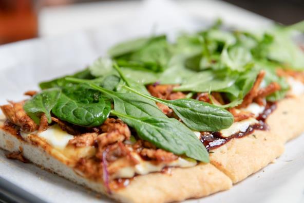 Uklonite i bacite foliju sa pleha za pečenje. Na svaki pleh rasporedite po 1 somun. Namažite svaki somun sa 60 ml sosa, šireći na centimetar od ivica. Preko sosa ravnomerno rasporedite sir, piletinu i masline.