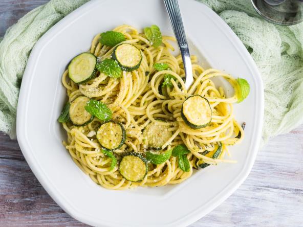 Za špagete sa grilovanim tikvicama prvo zagrejte gril tiganj na srednje jaku vatru, oko 5 minuta. U posudi pomešajte tikvice, ulje i 1 kašičicu soli. Ostavite da odstoji 5 do 10 minuta dok se tiganj zagreje. Radite u serijama ako je potrebno, pecite tikvice na žaru, okrećući ih, 5 do 6 minuta po strani. U velikom loncu sa ključalom slanom vodom kuvajte testeninu, povremeno mešajući, do al dente, oko 10 minuta.