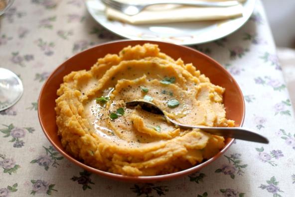Zgnječite krompir gnječilicom, dodajte pavlaku za kuvanje, puter i med pa promešajte da se sjedine. Zatim dodajte so, biber, đumbir, ljutu papriku i kari pa sve dobro izmešajte. Odozgo stavite listove majčine dušice. Servirajte i uživajte. Možda ćete želeti da napravite i batat punjen piletinom i pesto sosom.