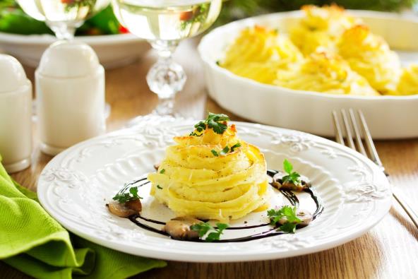 Zagrejte rernu na 220C/200C sa ventilatorom. Pleh obložite papirom za pečenje. Kašikom stavljajte po 100 g pire krompira na pripremljeni pleh. Oblikujte ih u kupe visine oko 6 cm. Potom lagano poprskajte uljem i pospite parmezanom.