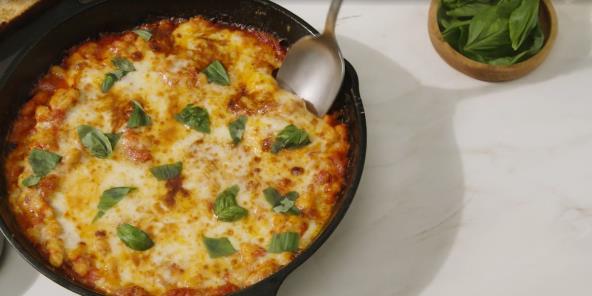 Dodajte paradajz koji ste stavili na stranu, origano, mlevenu papriku i 1 kašičicu soli. Pustite da provri na jačoj vatri, a zatim smanjite temperaturu i kuvajte, povremeno mešajući, dok se sos ne zgusne, 10 do 15 minuta. Dodajte pasulj i promešajte da se sjedine. Kuvajte, povremeno mešajući, dok se ne zagreje, još 1 do 2 minuta. Odozgo pospite mocarelom i parmezanom.