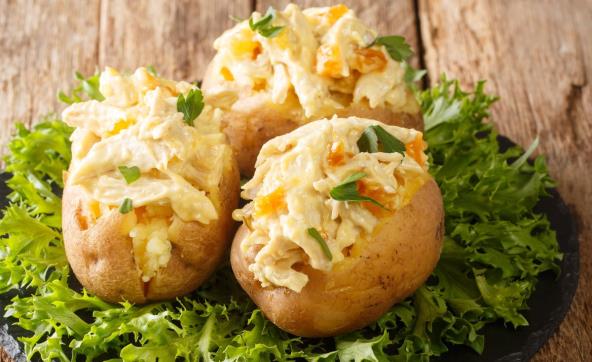 Kako biste napravili ove krompire, zagrejte rernu na 200 C. Očistite, i iseckajte piletinu. Krompir premažite uljem i pospite solju i biberom. Viljuškom probušite nekoliko rupa na prednjoj i zadnjoj strani krompira. Pecite 40-45 minuta ili dok unutrašnjost ne bude pečena.